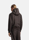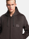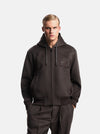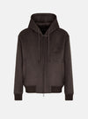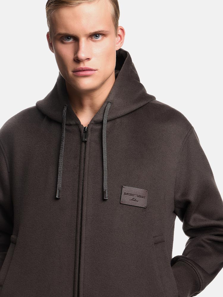 Blouson with drawstring hood and front zip. The piece, with urban appeal, is made of warm pure virgin wool cloth. The patch on the chest with a tumbled finish and embossed logo, adds a touch of distinction.